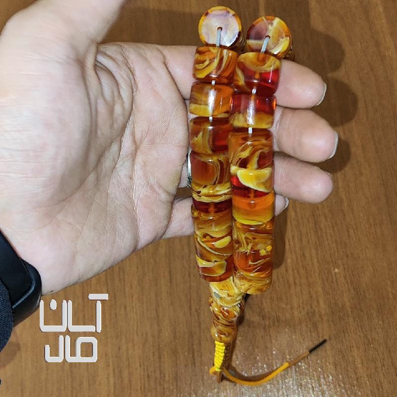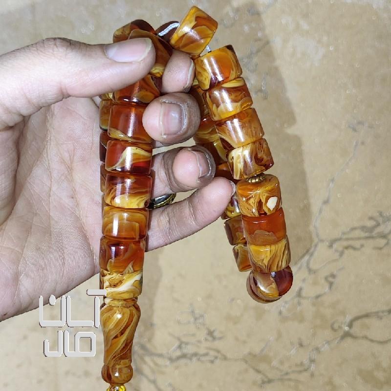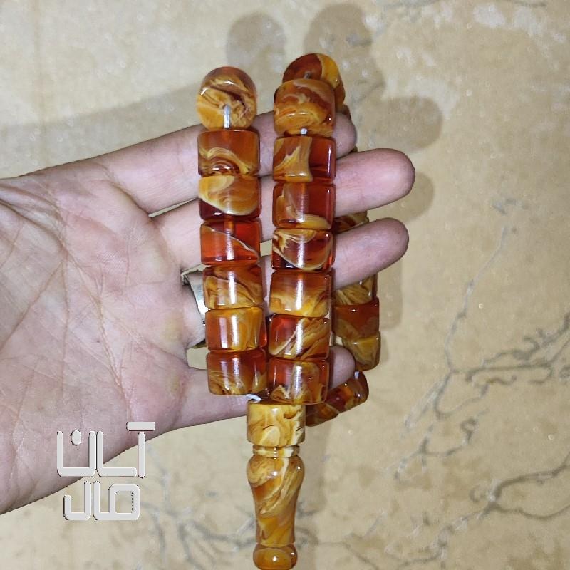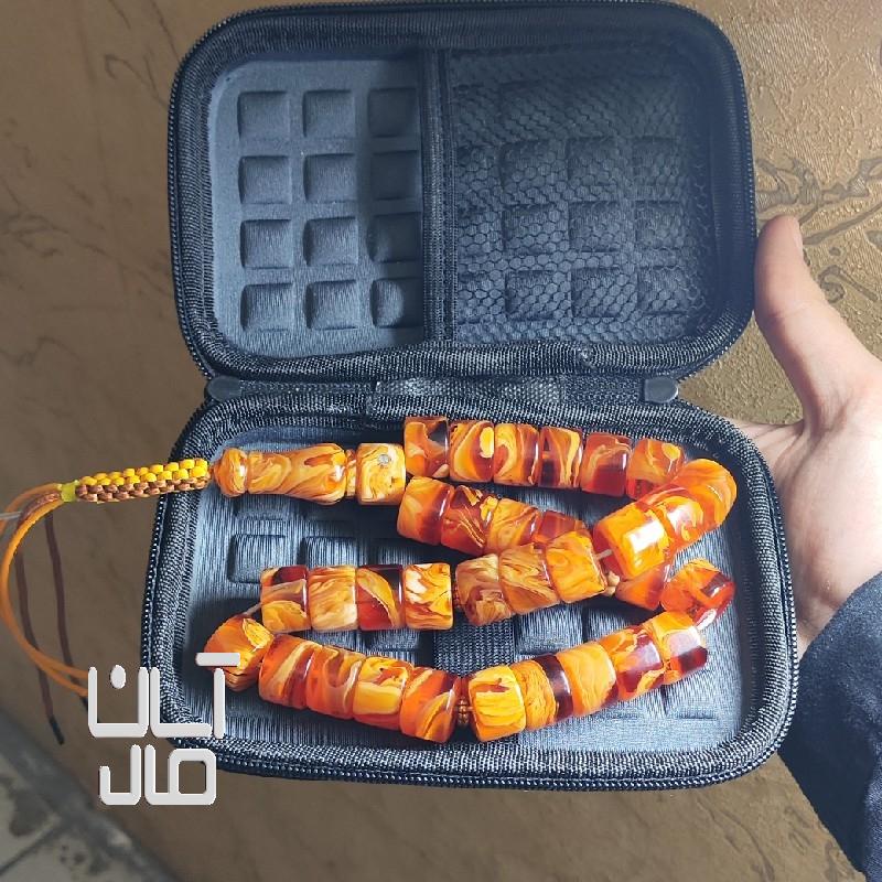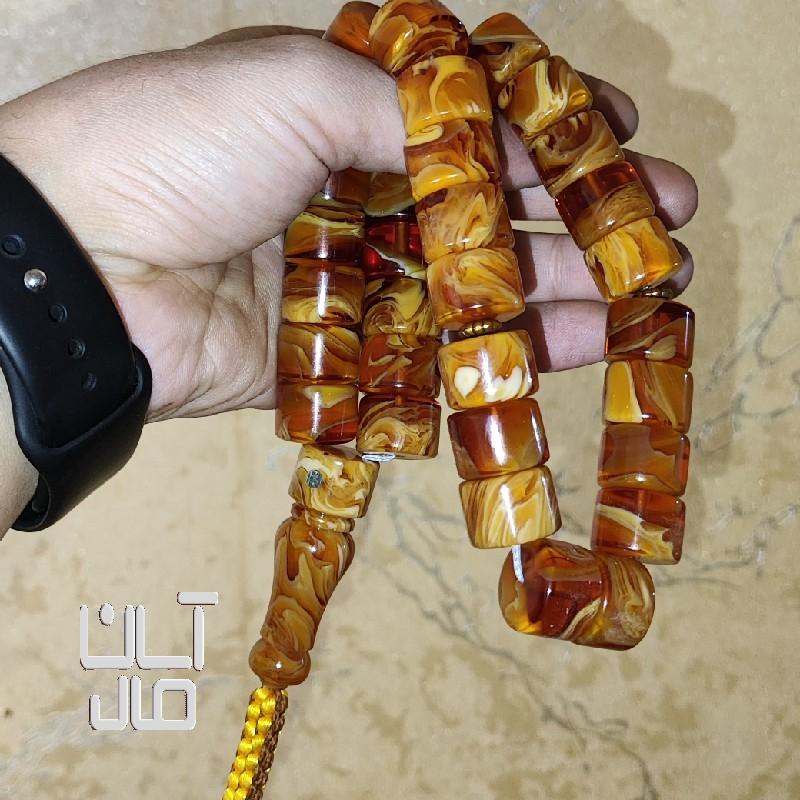 تسبیح کهربا کره عسلی مزین به مُهر نقره استاد تراش